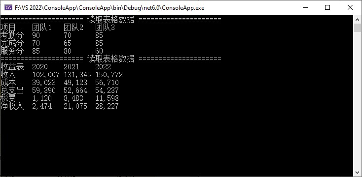 console.writeline("===================== 读取表格数据 =====================");