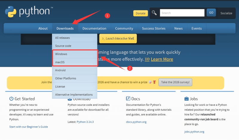 访问官方网站:https://www.python.org/