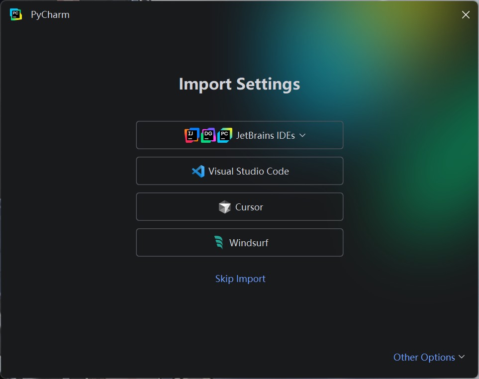 打开 pycharm,如果你使用过其他工具,可以点击对应的选项,一键设置,否则点击skip import