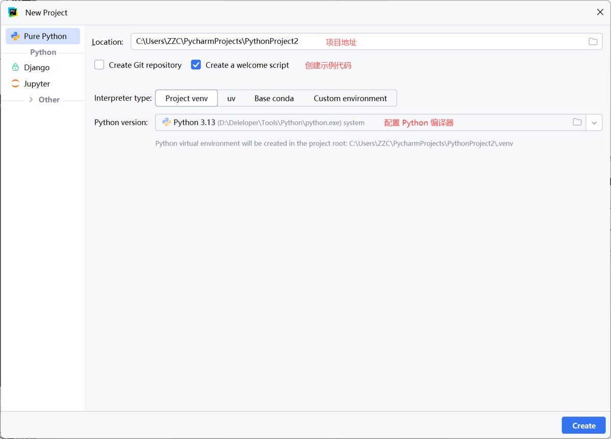点击 新建项目(new project),这里最重要的是配置 python 编译器,如果没有 python 编译器,可能是没有安装 python 回到上面进行安装。
