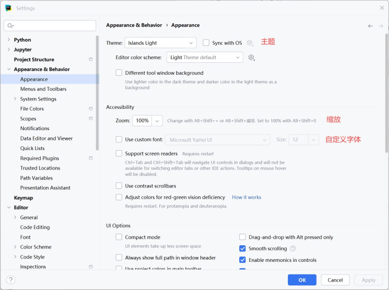 点击appearance & behavior → appearance,这是外观,在这里可以设置主题(深浅色)、缩放大小、自定义字体等。