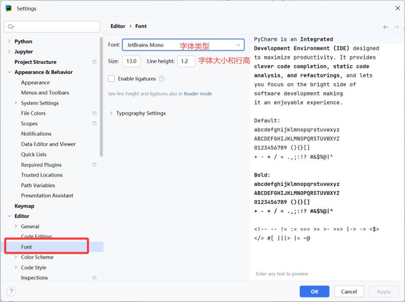 点击editor → font,这里可以设置字体大小、类型和行高,右侧是示例字体。