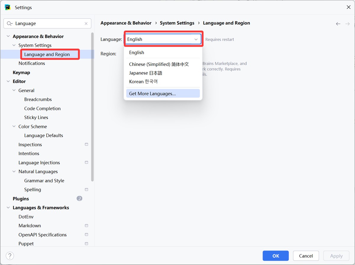 在settings 设置内,可以搜索language,点击apperance & behavior → system settings → language and region 中,可以直接将语言改为中文,点击 ok 即可。