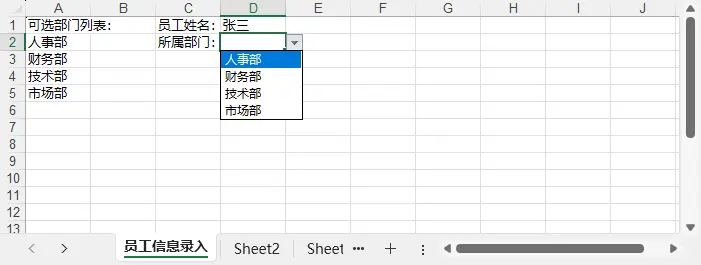 在实际业务中,员工部门通常是固定的几个选项,例如"人事部"、"财务部"、"技术部"、"市场部"。我们可以在工作表中创建下拉列表,强制用户从预定义的部门列表中选择,避免输入错误或格式不统一。