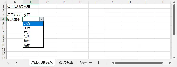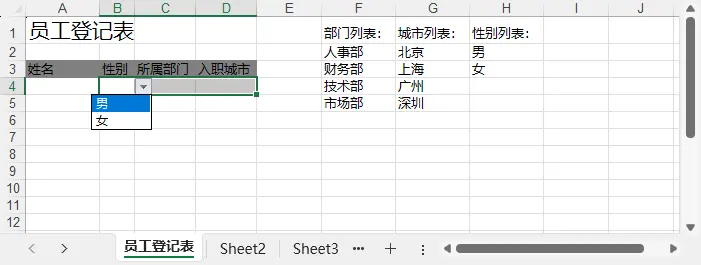 在实际应用中,我们经常需要在一个表格中设置多个下拉列表,例如员工登记表中既需要选择部门,也需要选择城市。下面是一个综合示例: