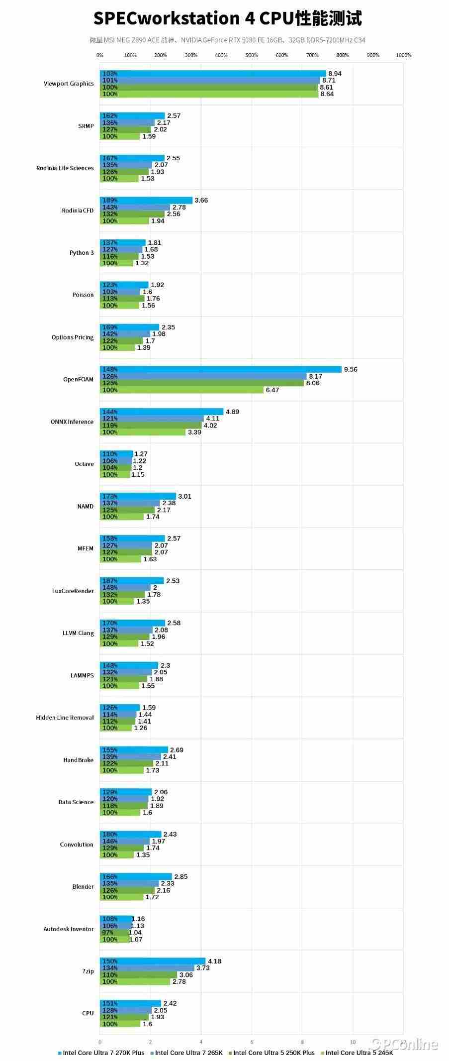 最后再上点强度,来点工业级的测试,specworkstation 4 是面向专业工作站级别的权威性能测试工具,覆盖科学计算、工程仿真、流体力学、3d 渲染、数据科学等专业领域,能全面衡量处理器在工业级、科研级重度负载下的综合性能。实测数据显示,酷睿 ultra 7 270k plus 在全场景测试中实现全面领先,其中流体力学 rodiniacfd 场景相较前代提升 46%,3d 渲染 luxcorerender 场景则提升 39%,数值计算 convolution 场景也有34%的增幅;酷睿 ultra 5 250k plus 在各专业场景中也均实现 10% 以上的稳定提升,部分项目甚至提升幅度有20%以上,为工业设计、科研计算等专业场景提供了充足的算力支撑。