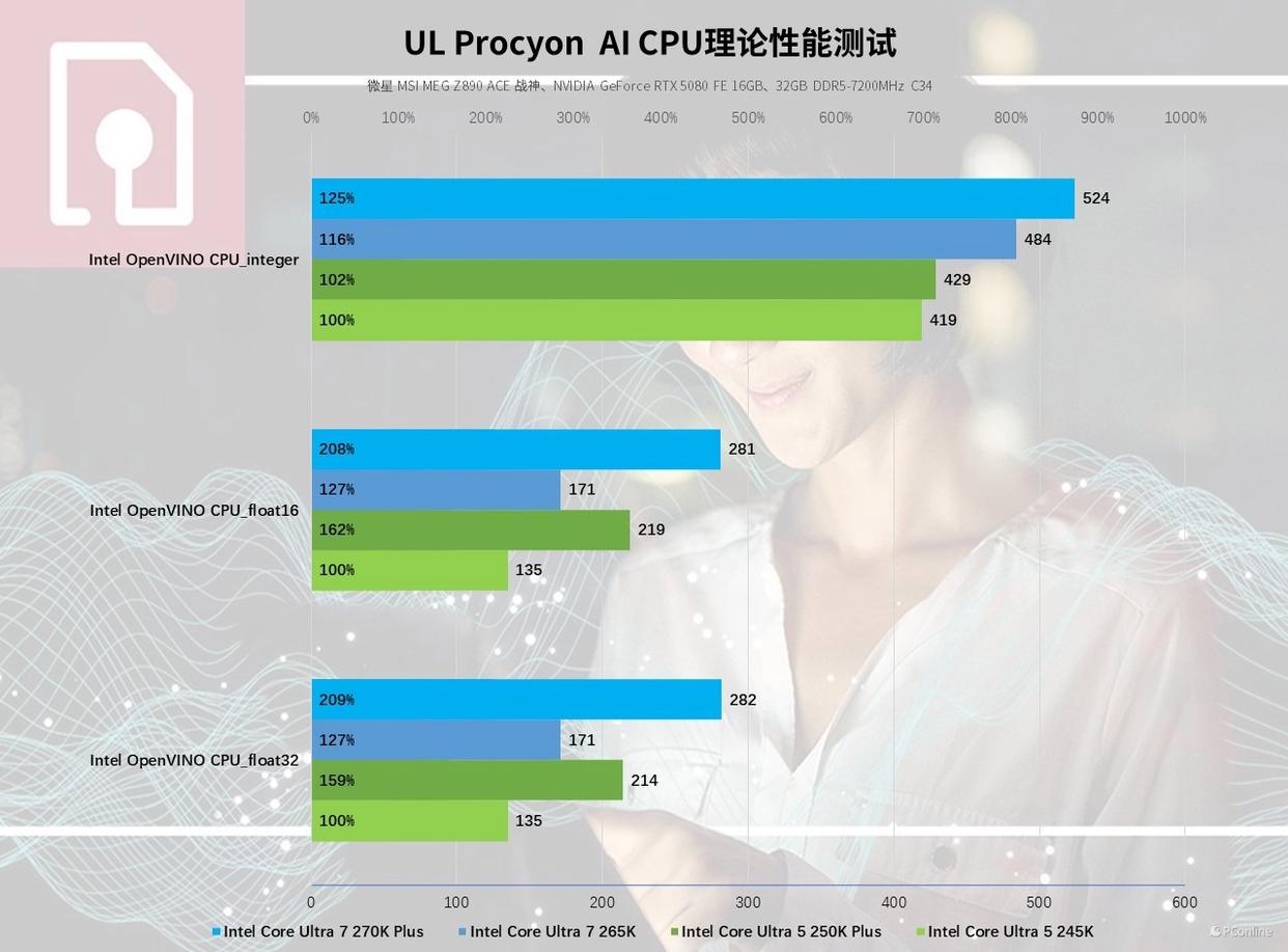 而cpu 端 ai 算力就更精彩了,凭借核心规格扩容、底层架构优化与首创二进制优化技术的加持,两款新品的 cpu 端 ai 算力实现了跨越式提升。以酷睿 ultra 5 245k 为性能基准,酷睿 ultra 5 250k plus 在 integer 精度测试中实现 2% 的性能提升,float16 与 float32 精度测试中分别达成 62%、59% 的大幅跃升。酷睿 ultra 7 270k plus 表现也类似,integer 精度测试得分 524,对比前代提升9%;float16 与 float32 精度测试得分分别达到 281、282,提升幅度更是来到了73%,在重度 ai 推理、批量 ai 运算场景下展现出极强的处理能力。