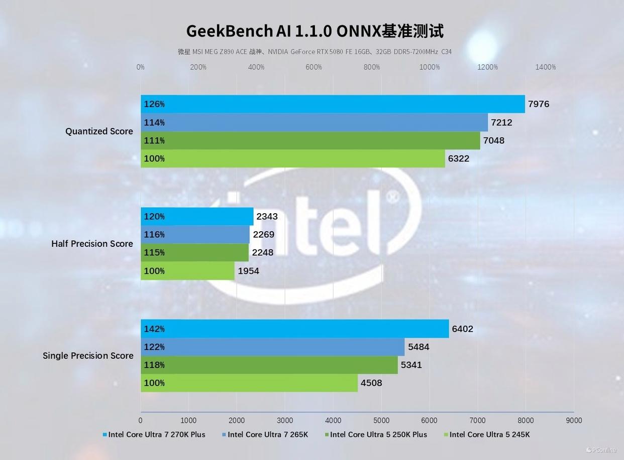 从实测结果来看,酷睿 ultra 200s plus 系列的 ai 综合性能实现了全面领先,核心优势集中体现在全精度场景的稳定输出。以酷睿 ultra 5 245k 为 100% 性能基准,酷睿 ultra 5 250k plus 量化得分 7048,提升约11%;酷睿ultra 7 270k plus则得分7976,对比酷睿ultra 7 265k的7212分,涨幅约12%。