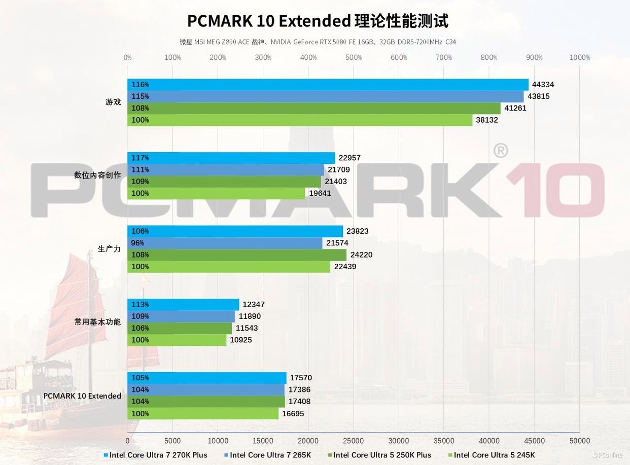 从实测数据来看,以酷睿 ultra 5 245k 为性能基准,酷睿 ultra 5 250k plus 数位内容创作得分 21403,相较基准提升 9%;酷睿 ultra 7 270k plus 得分 22957,提升幅度达17%,前代对比的话,也有6%的性能优势,跟上面我们渲染测试的性能跃升基本吻合。生产力与日常基础功能方面,两款新品也均实现5%以上的稳定提升。至于游戏子项测试,这是提升最大的一环,酷睿 ultra 7 270k plus 得分 44334,而酷睿ultra 5 250k plus则是以41261的成绩领先前代8%,纸面表现亮眼,其真实游戏表现,我们将在后续实机测试中进一步验证。