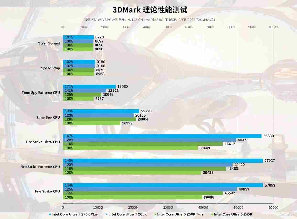 游戏性能测试游戏测试前,先用3dmark看看cpu的性能表现,3dmark 是全球通用的游戏性能基准测试工具,覆盖 dx12、dx11 等主流图形 api,适配从入门级到旗舰级的全平台游戏负载。实测酷睿 ultra 5 250k plus 在 dx12 time spy cpu 测试中得分 20864,相比245k提升 28%,dx11 fire strike cpu 测试得分 45592,提升约15%。至于酷睿 ultra 7 270k plus 性能跃升更为显著,time spy cpu 得分 21790,相较265k提升 10%,time spy extreme cpu 得分 15030,提升 30%,fire strike ultra cpu 得分 56639,同样也有接近20%的提升,即便是最新的 speed way、steel nomad 测试项目,也实现了 1%-2% 的领先。