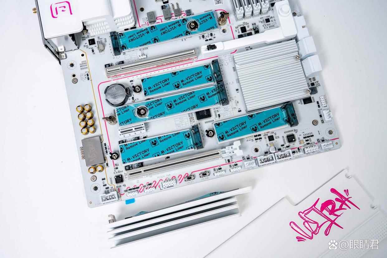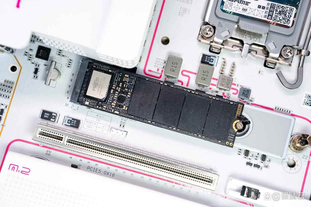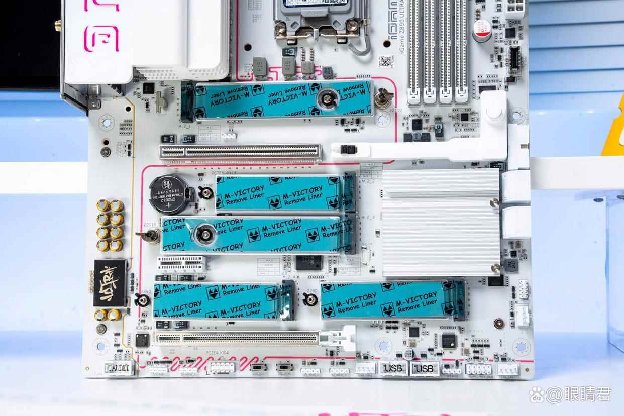 主板拥有5个m.2插槽,最上方独立散热装甲的接口支持pcie 5.0,其余4个均为pcie 4.0,其中靠近cpu的1号和2号m.2插槽采用的是直连cpu,其余3个则是芯片组扩展出来的。