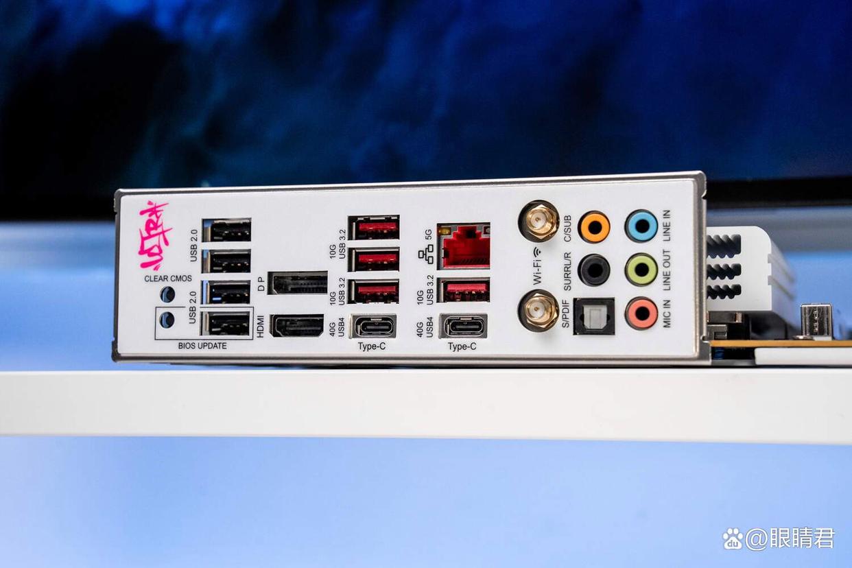 背部io面板,除了usb 2.0和usb 3.2接口,七彩虹z890 ultra-s提供2个全功能40gbps usb 4接口。网络接口升级为有线5g,同时配置了be200 wifi 7无线网卡。