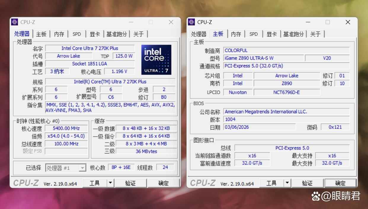 主板igame z890 ultra-s w,bios版本1004,0x121微码支持最新ultra 7 270k plus处理器。