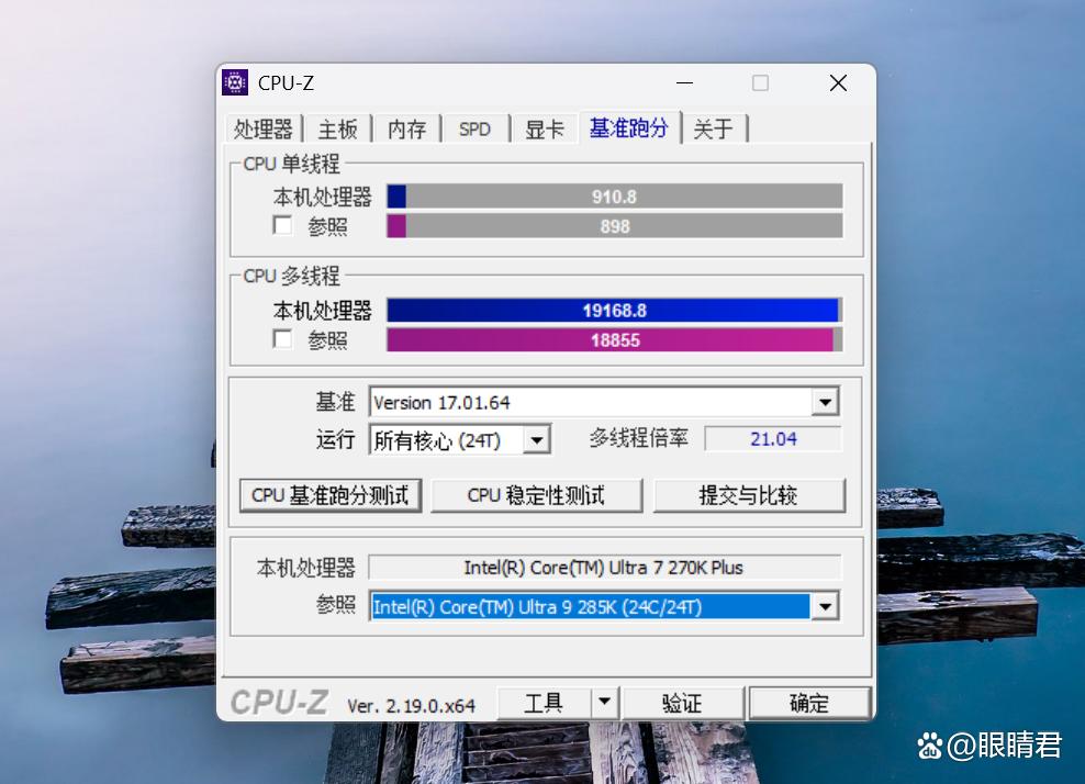 cpu-z测试跑分,单核910分,多核19168分。单核多核得分甚至都超过了作为参照对比的酷睿ultra 9 285k成绩。