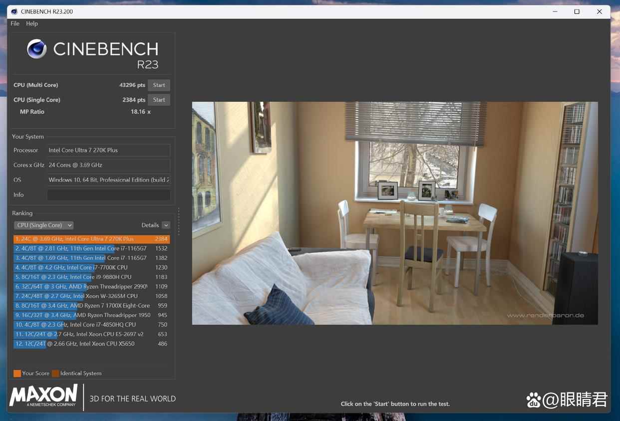 cinebench r23测试,单核得分2384,多核得分43296,对比此前ultra 7 265k单核得分2012,多核得分34232,单核得分提升18%,多核更是达到了26%,均大幅提升。
