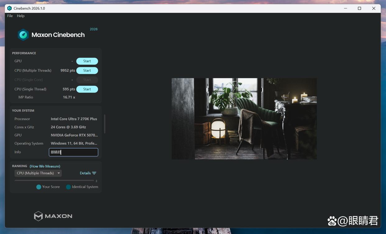 最新版cinebench 2026测试,单核得分595,多核得分9952,单核多核表现均十分出色。