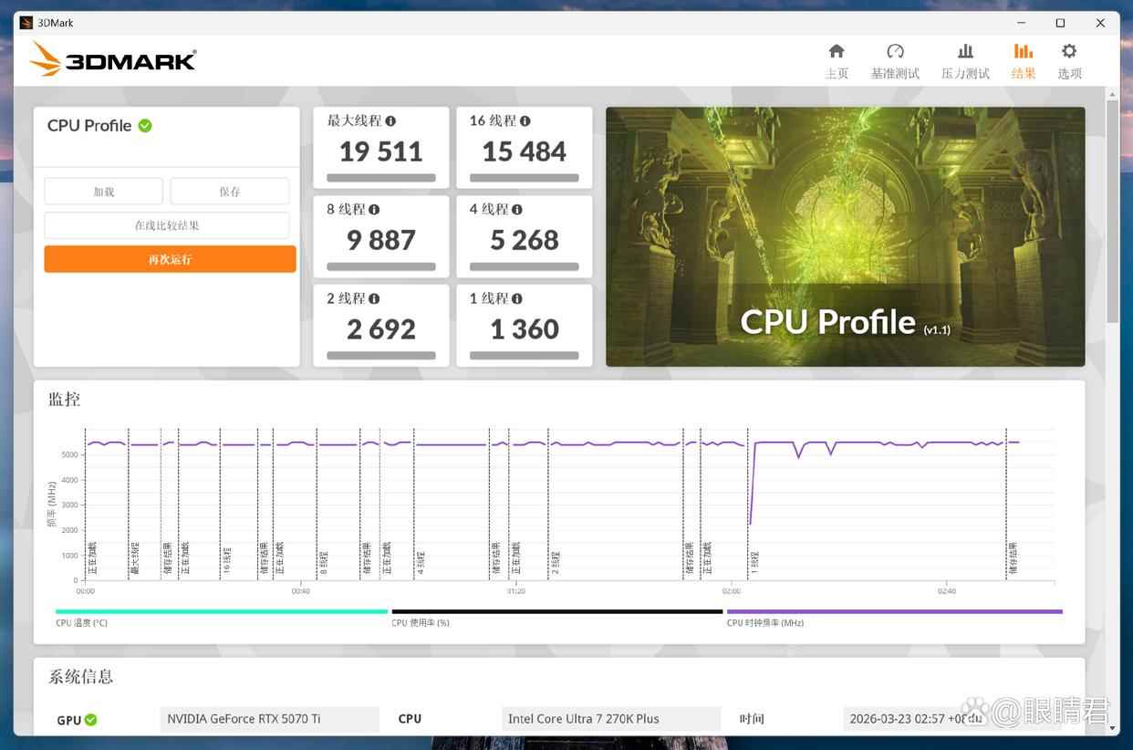 3dmark cpu profile测试,最大线程得分19511,单线程得分1360。