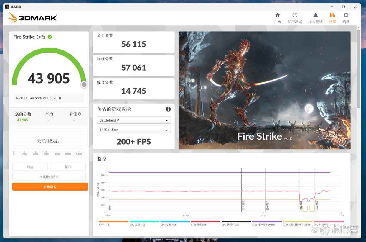 fire strike测试,物理得分57061分,显卡得分56115分。