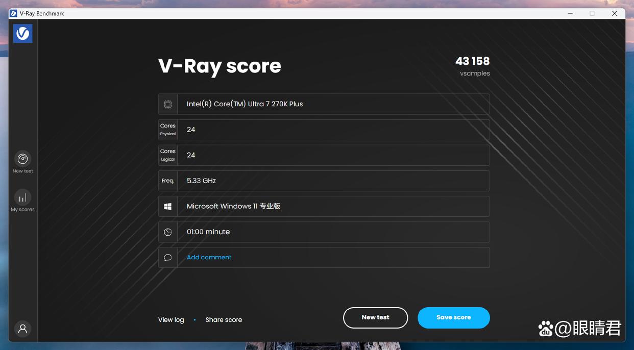 v-ray渲染测试,酷睿ultra 7 270k plus测试得分为43158分。