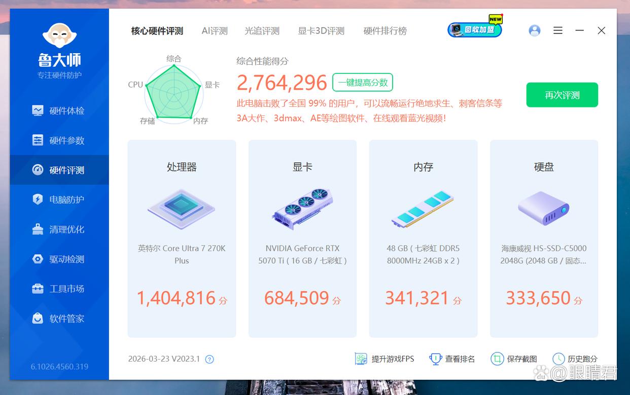 鲁大师跑分,整机得分276万分,cpu得分140万分。
