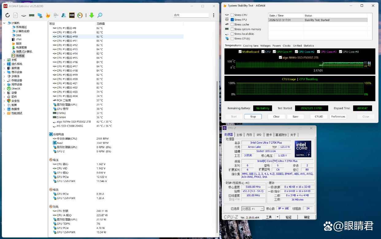 cpu-z系统信息:处理器intel 酷睿 ultra 7 270k plus,8p+16e核心,总线程数24。