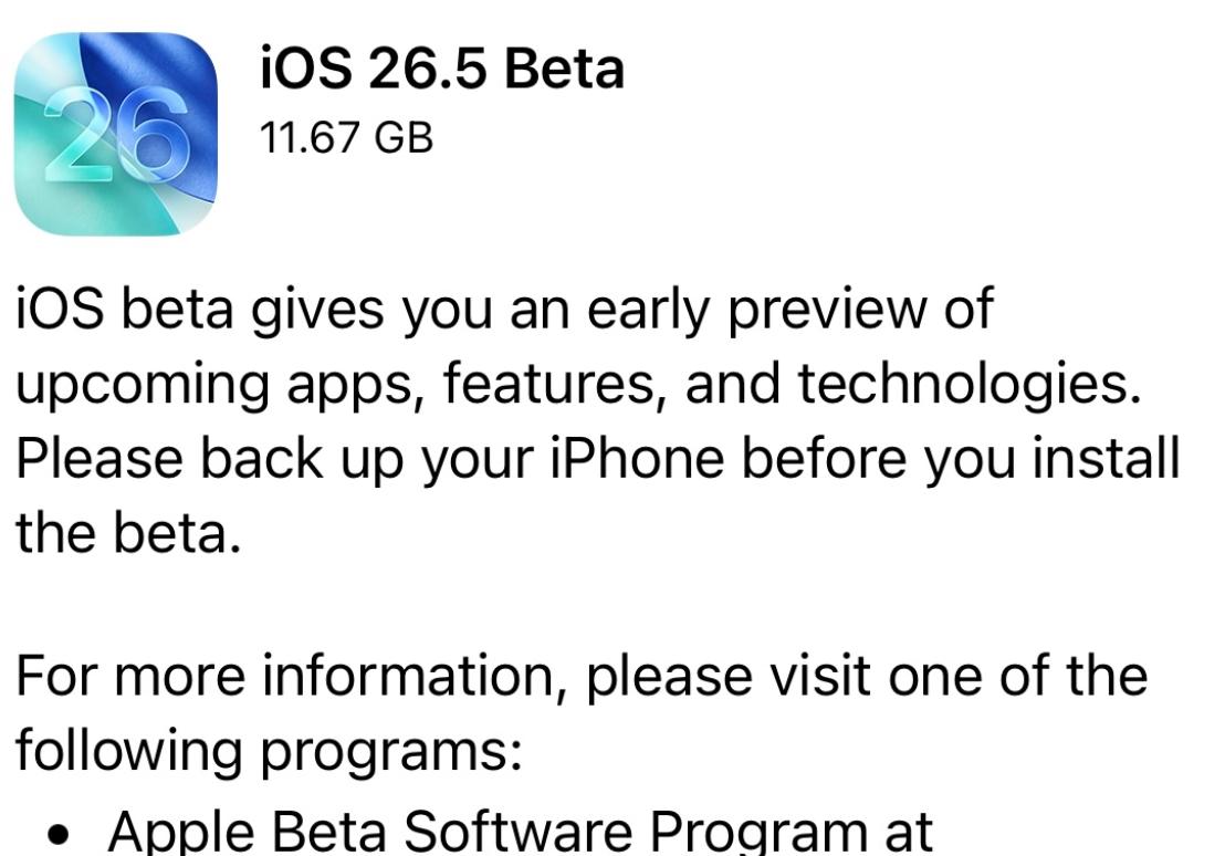 苹果目前向iphone手机推送了ios26.5beta1首个开发者预览版升级,推送升级的内部版本号为23f5043g,推送的升级更新包大小达12gb(不同机型推送的升级更新包大小不一样)。