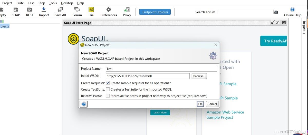 点击soap菜单,输入一个名称(名称随意取)。输入wsdl的地址。点击ok。