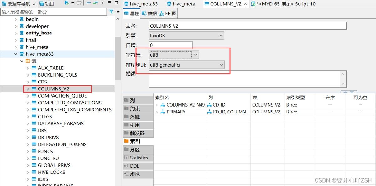 1、修改hive元数据库的编码格式,这里以元数据库为mysql为例