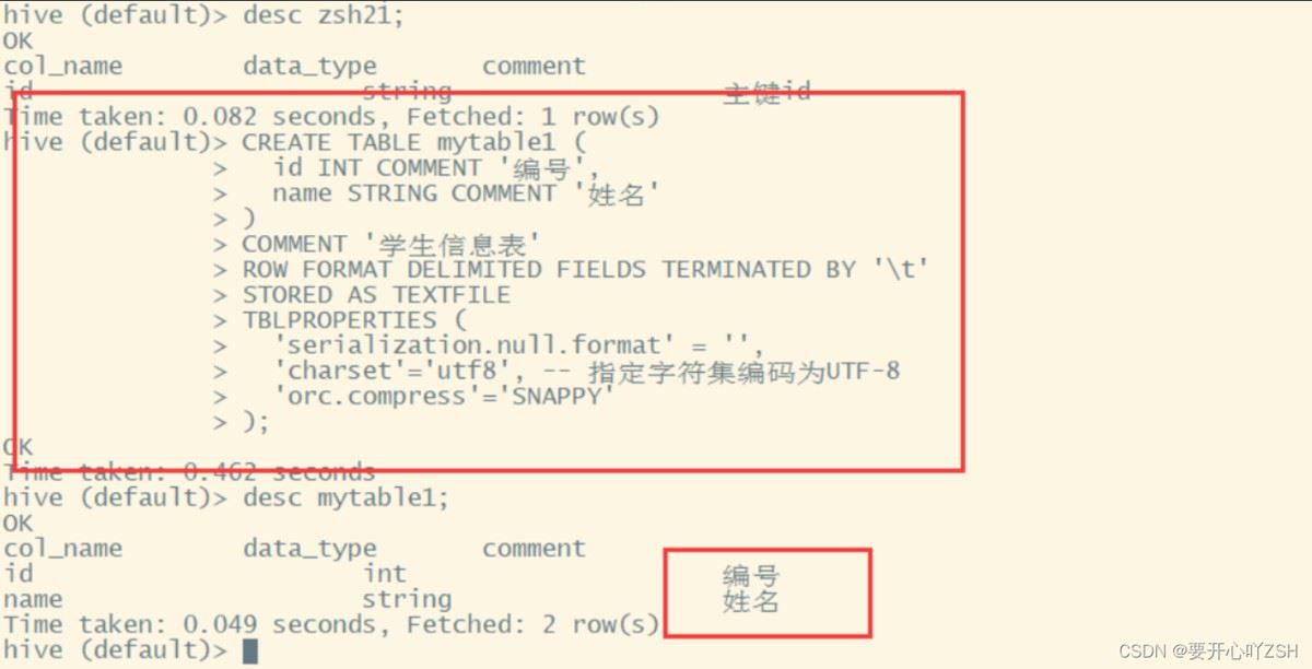 create table mytable ( id int comment '编号', name string comment '姓名' ) comment '学生信息表' row format delimited fields terminated by '\t' stored as textfile tblproperties ( 'serialization.null.format' = '', 'charset'='utf8', -- 指定字符集编码为utf-8 'orc.compress'='snappy' );