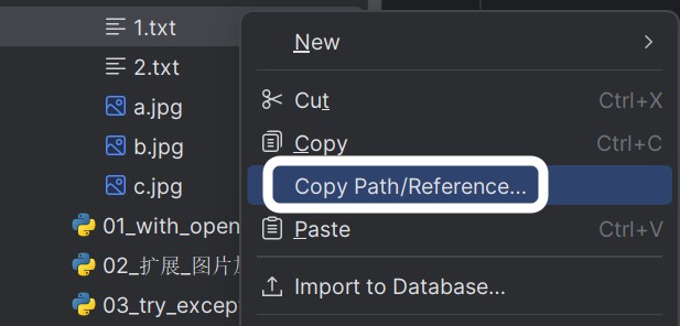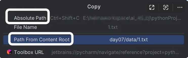 点击后可查看文件的绝对路径和 项目根相对路径(相对于项目文件夹)