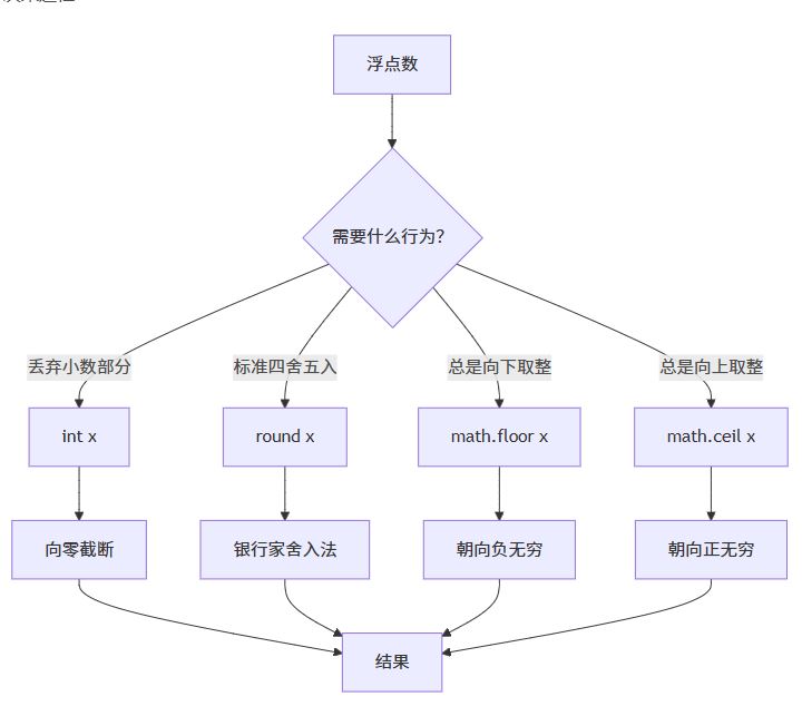 关键区别:int() 不是四舍五入!它简单地丢弃小数部分。这在处理负数时尤其容易出错。例如,int(-3.7) 返回 -3 而非 -4,因为它是向零截断(朝向0的方向)。
