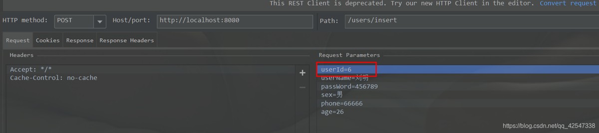 参数以key-value形式传递,参数和值会直接拼接到请求url后边显示存在(post http://localhost:8080/users/insert?id=5&username=刘明);