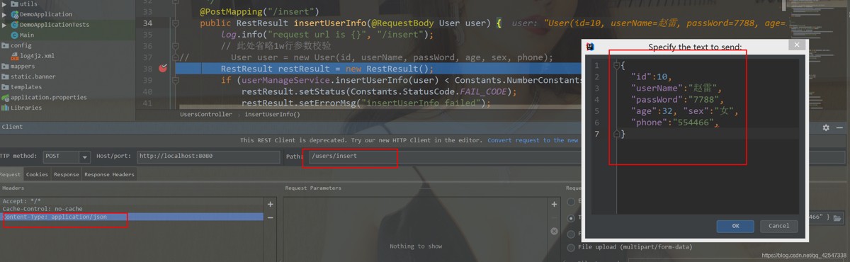 public restresult insertuserinfo(@requestbody user user) {...}