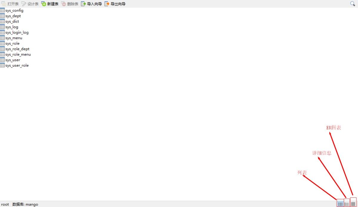 可以看到右下角,有三个查看选项,分别是列表、详细信息、er图表