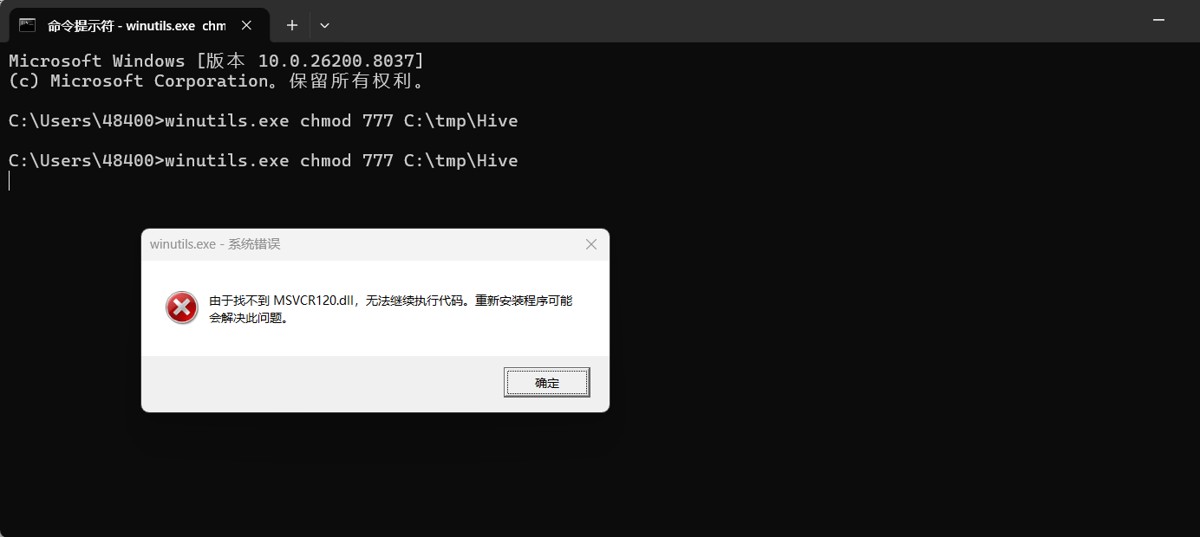 msvcr120.dll是 visual c++ 2013 运行时库,常在 hadoop 的hadoop.dll调用失败时出现。- 即使你不用