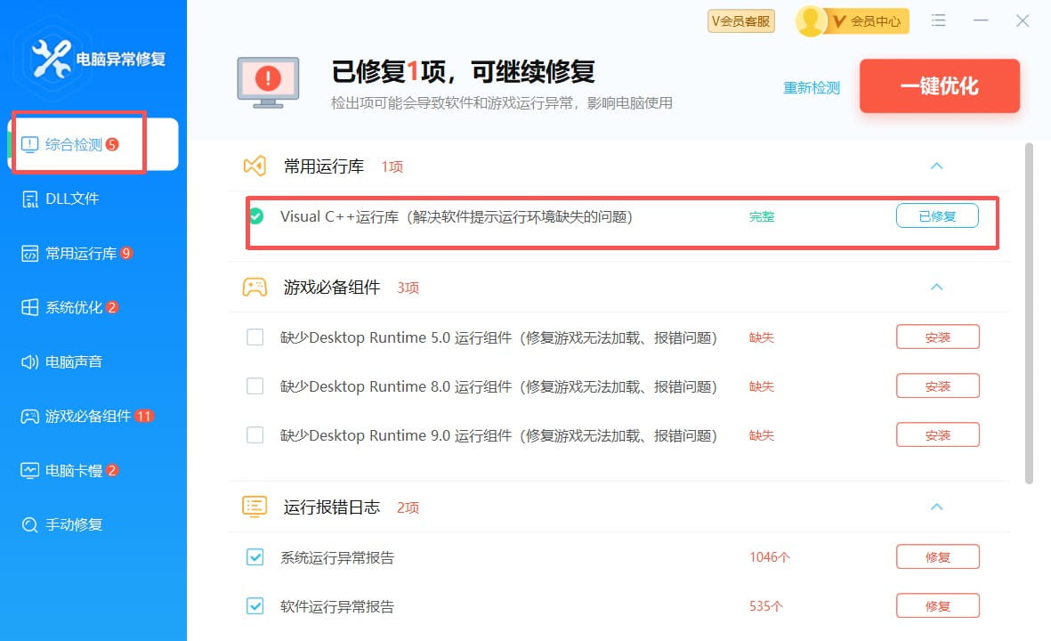 修复 msvcr120.dll 可以用联想的电脑异常修复直接修复