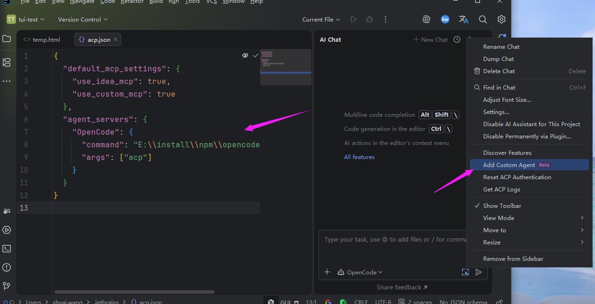 在ai chat->设置->add custom agent中,就会打开acp.json。