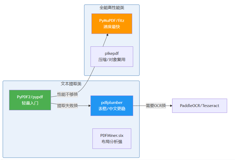 | 缺点 | 大文件内存占用高 | 将整个pdf加载到内存,几百页可能卡死 |