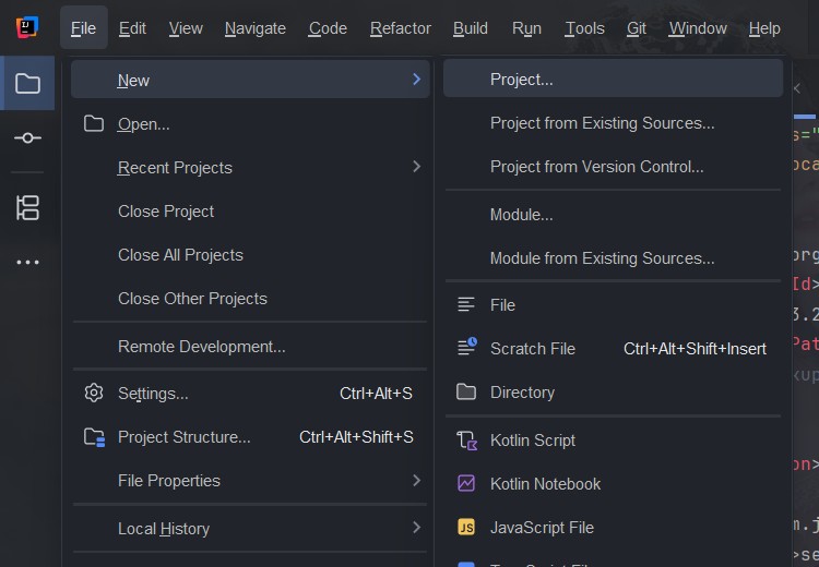 file -->> new -->> project