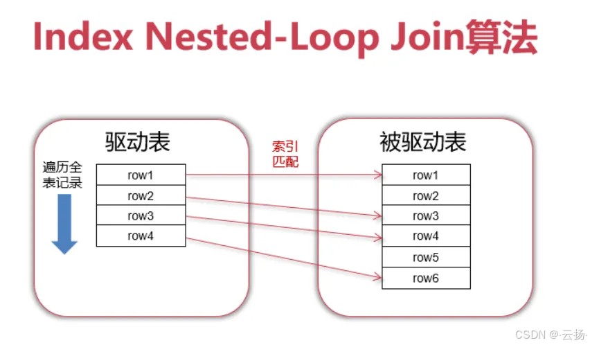 | index nested-loop join | 驱动表每行→通过索引定位被驱动表匹配数据 | 被驱动表关联字段有索引 | 扫描行数少,依赖索引效率 |
