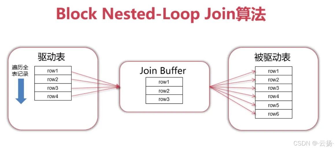 | block nested-loop join | 驱动表数据批量写入join_buffer→被驱动表每行与缓冲区数据对比 | mysql 8.0.20前,被驱动表无索引 | 减少全表扫描次数,依赖缓冲区大小 |