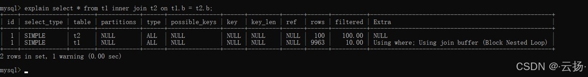 -- 关联字段b无索引(t1、t2的b字段均未建索引) explain select * from t1 inner join t2 on t1.b = t2.b;