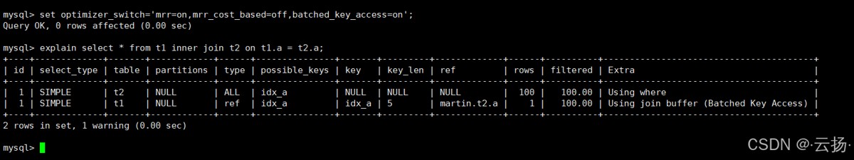 -- 开启mrr和bka set optimizer_switch='mrr=on,mrr_cost_based=off,batched_key_access=on'; -- 验证bka是否生效 explain select * from t1 inner join t2 on t1.a = t2.a;
