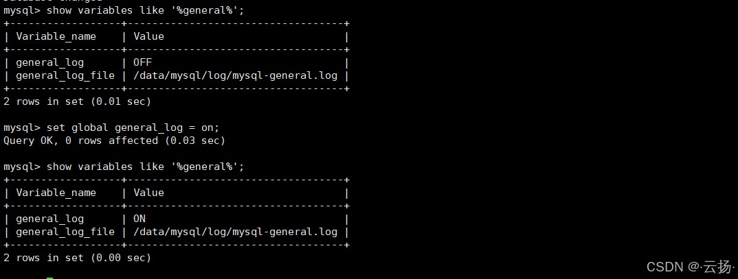 # 1. 查看当前general log状态及相关配置 show global variables like "general%"; # 2. 开启general log(临时生效) set global general_log = on; # 3. (可选)自定义日志存储路径(默认路径通过general_log_file参数查看) set global general_log_file = '/data/mysql/log/mysql-general.log';