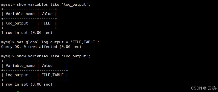 # 1. 查看当前日志输出方式 show global variables like "log_output"; # 2. 设置输出方式(支持三种组合:file、table、file,table) set global log_output = 'file,table'; # 同时输出到文件和表
