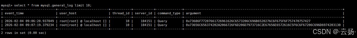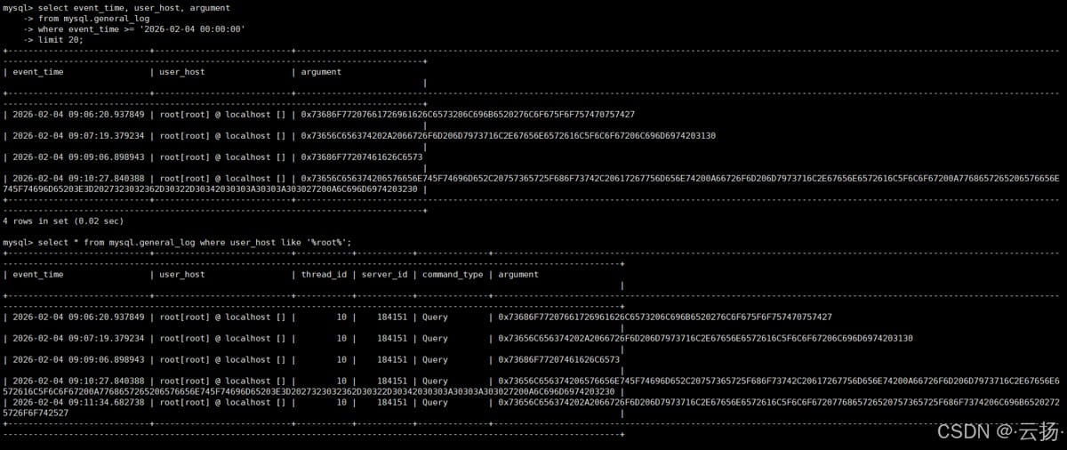-- 按时间范围查询日志 select event_time, user_host, argument from mysql.general_log where event_time >= '2026-02-04 00:00:00' limit 20; -- 查询特定用户的操作记录 select * from mysql.general_log where user_host like '%root%';