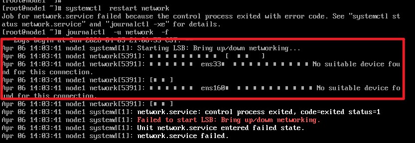 通过journactl -u network -f可以看到network启动报错原因是因为两张网卡设备,找不到
