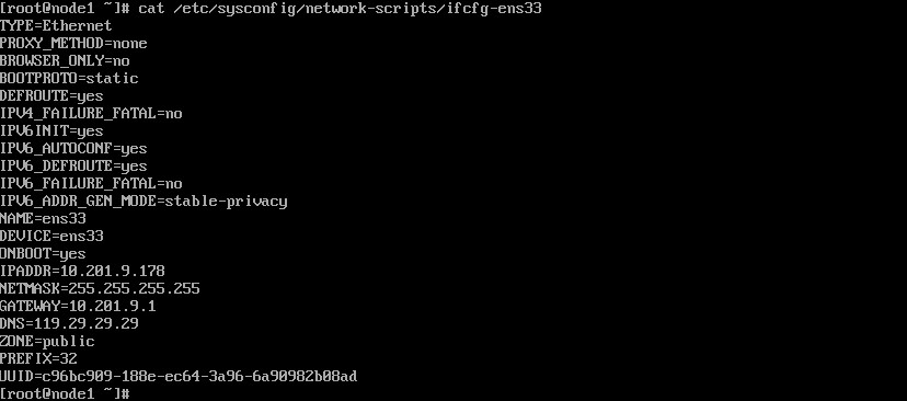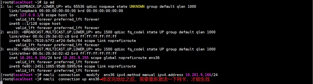# 设置新链接test的ip地址,网关、dns [root@localhost yum.repos.d]# nmcli connection modify test ipv4.method manual ipv4.addresses 10.201.9.199/24 ipv4.gateway 10.201.9.1 ipv4.dns 8.8.8.8 connection.autoconnect no # 激活test的网卡连接,即可切换到test所配置的ip地址 [root@localhost yum.repos.d]# nmcli connection up test ens36