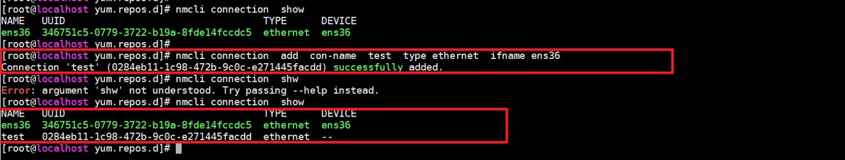 [root@localhost yum.repos.d]# nmcli connection show name uuid type device ens36 346751c5-0779-3722-b19a-8fde14fccdc5 ethernet ens36 [root@localhost yum.repos.d]# nmcli connection add con-name test type ethernet ifname ens36 connection 'test' (0284eb11-1c98-472b-9c0c-e271445facdd) successfully added. [root@localhost yum.repos.d]# nmcli connection show name uuid type device ens36 346751c5-0779-3722-b19a-8fde14fccdc5 ethernet ens36 test 0284eb11-1c98-472b-9c0c-e271445facdd ethernet --
