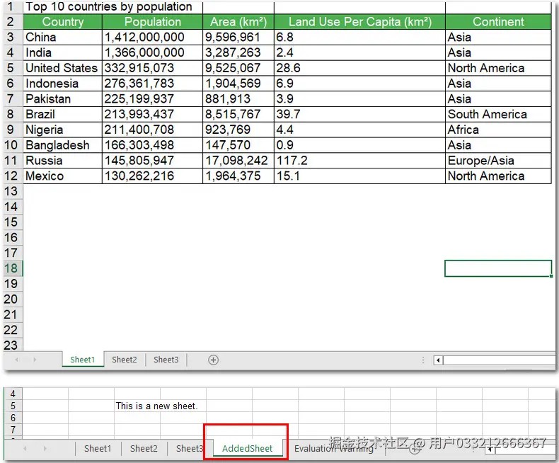 以下代码演示了如何加载一个现有的 excel 文件,并向其中添加一个名为"addedsheet"的新工作表: